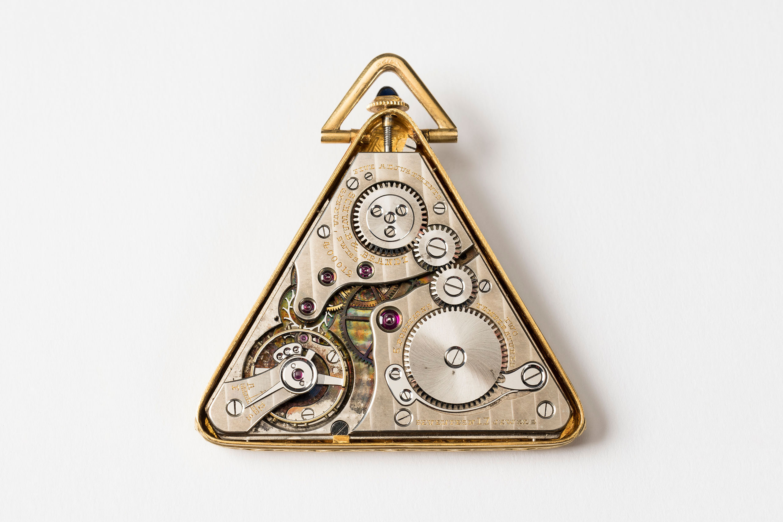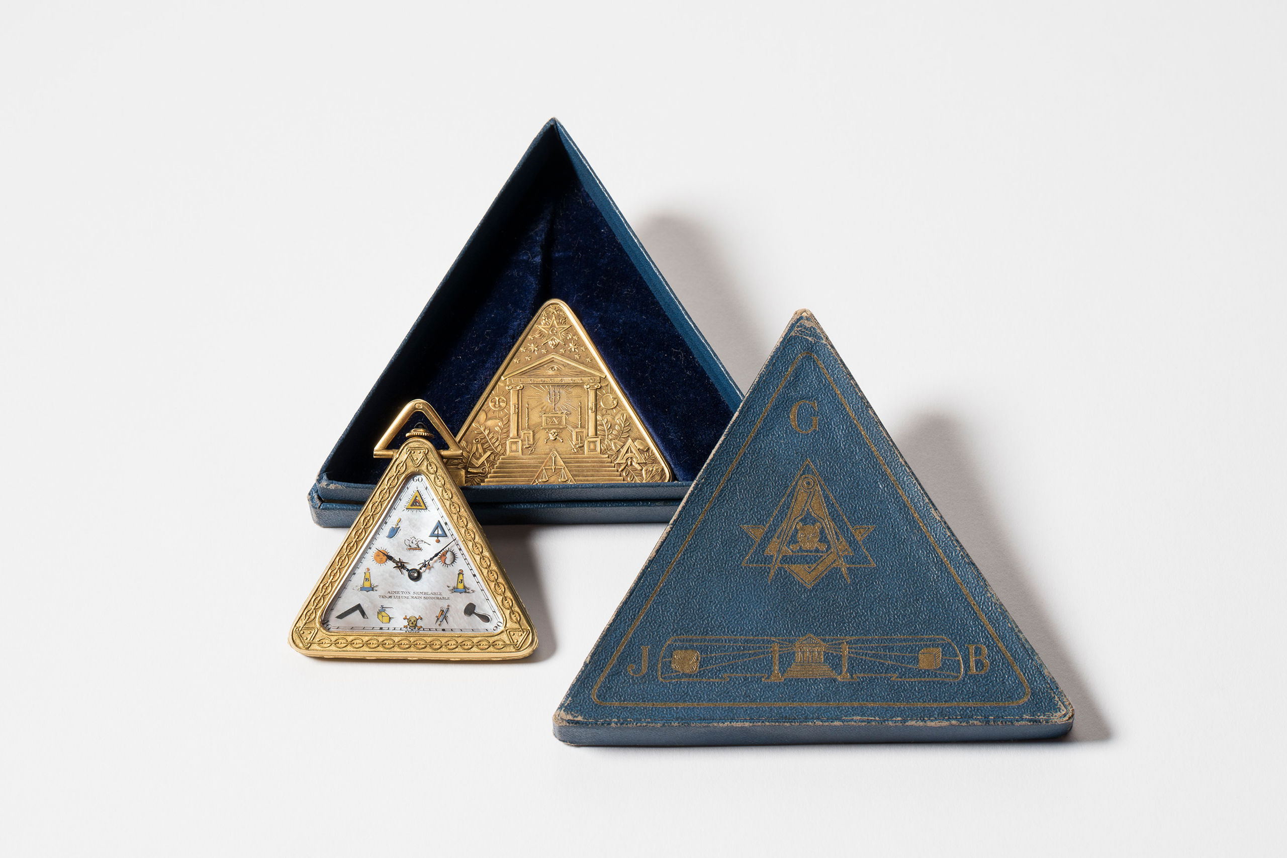 Die Zahl drei spielt in der Welt der Freimaurerei eine wichtige Rolle. So steht das Dreieck für die Führungsebene der Logen, den Meister, den ersten sowie den zweiten Aufseher. Bei der goldenen Taschenuhr zieht sich diese Form denn auch durch alle Bereiche. In der Regel beinhalten mechanische Taschenuhren ein rundes, der Form der Zahnräder angepasstes Werk. Hier ist von der Uhrenschachtel bis zum Werk alles dreieckig. Eine technische Herausforderung! Die Taschenuhr stammt etwa aus dem Jahr 1925 und trägt die Signatur der Firma Schwab & Brandt. Diese und ihre Vorgängerfirma konstruierten in Genf solche Uhren. Uhren mit dreieckigem Werk sind jedoch äusserst selten. Das mit Perlmutt belegte Zifferblatt und die goldene Rückseite der Uhr sind voller kleiner Bildzeichen. Auf dem Zifferblatt ersetzen sie die üblichen Zahlen. Wasserwaage, Maurerkelle, Säule und weitere Symbole beziehen sich auf die Arbeit der mittelalterlichen Bauhütten, haben aber zusätzliche Bedeutungen. Beispielsweise steht ein glatt geformter Steinblock für die Arbeit jedes Logenmitglieds an sich selbst und für die stetige Verbesserung des Charakters. Die vielgliedrige Kette, die die Lunette der Taschenuhr umrankt, wird auch «Bruderkette» genannt, sie steht für die Verbindung aller Logenmitglieder untereinander.