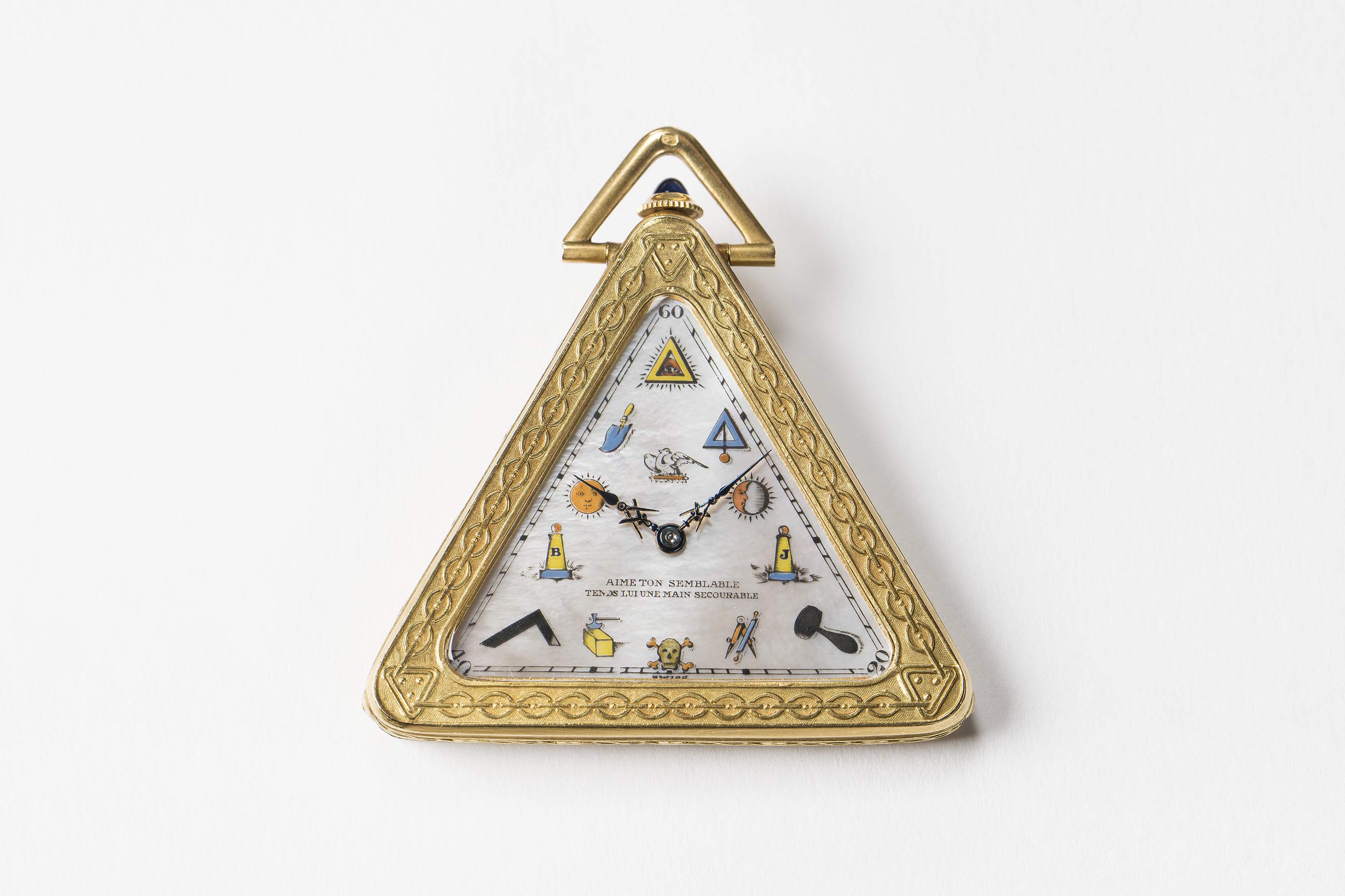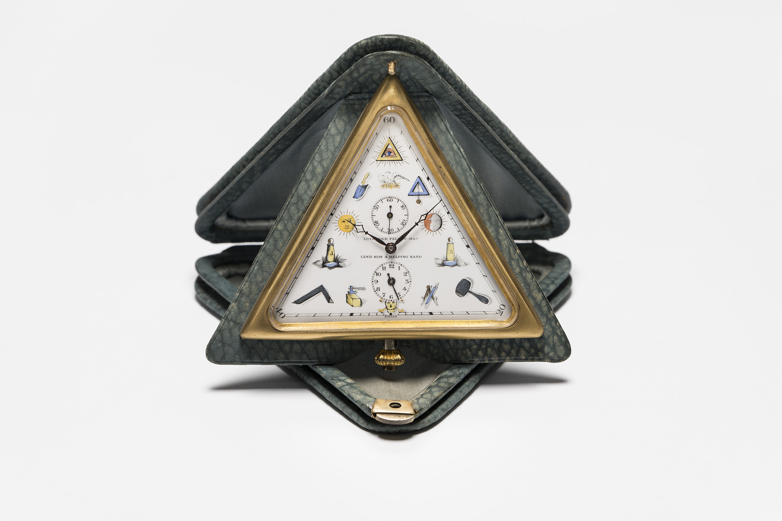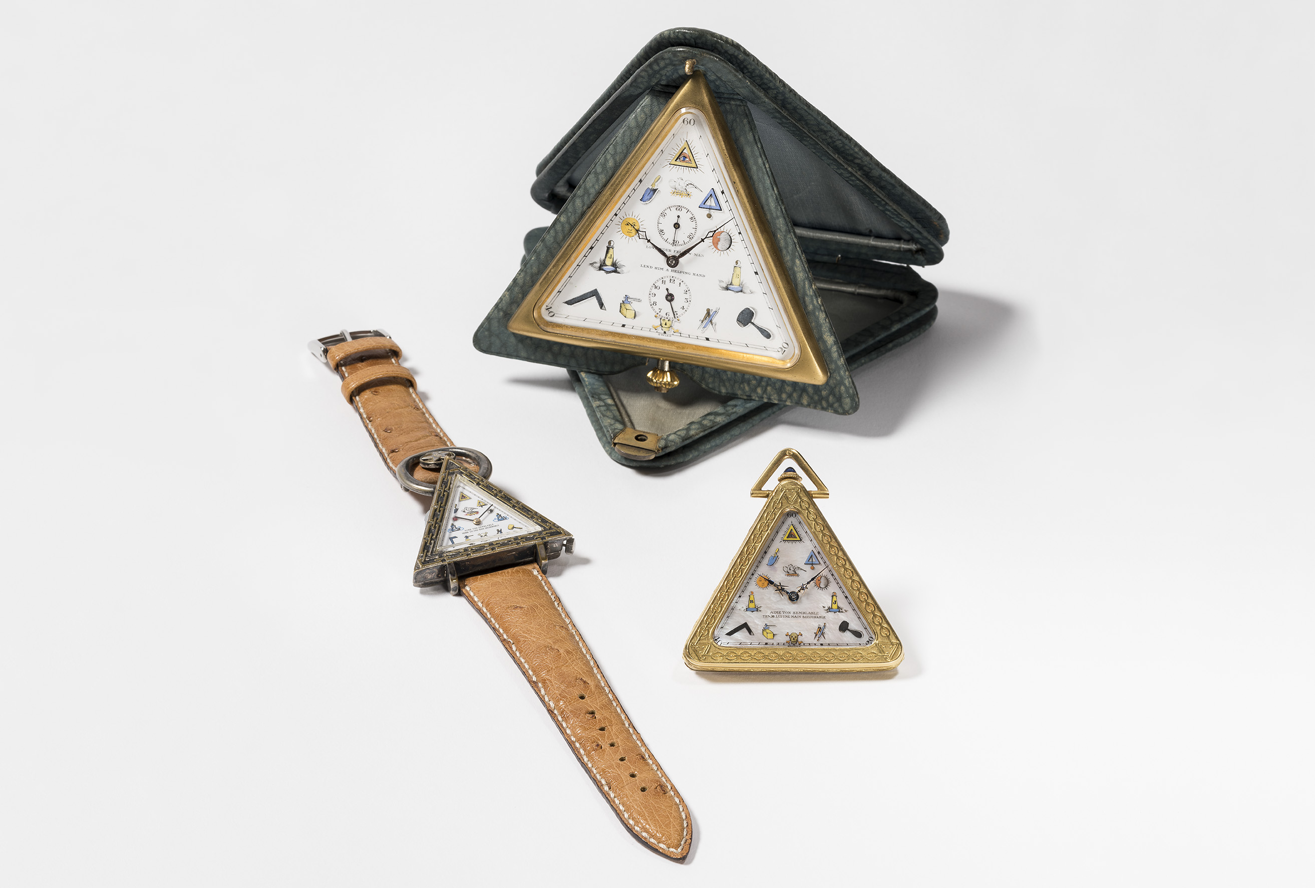 SujetGastspiel Uhrenmuseum Winterthur: «Drei Freimaureruhren aus dem Uhrenmuseum Beyer Zürich»; Goldene Freimaurer-Taschenuhr: Schwab & Brandt, Genf, um 1925, mit Original-Uhrenschachtel; Silberne Freimaurer-Armbanduhr, um 1930; Freimaurer-Wecker, aufklappbare Tischuhr in Lederetui; Leihgabe: Uhrenmuseum Beyer Zürich